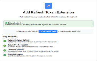 Add Refresh Token, Chrome tarayıcı eklentisi olarak, localhost geliştirme sürecini kolaylaştırmak için tasarlanmıştır. Bu araç, test ortamından otomatik olarak kimlik doğrulama token'larını alır ve bunları tüm localhost isteklerine entegre eder. Geliştiricilerin sürekli olarak token'ları kopyalayıp yapıştırmasına gerek kalmadan, arka planda sessizce çalışarak geliştirme sürecini kesintisiz hale getirir. Token'lar her saat yenilenir ve eklenti simgesi aracılığıyla manuel yenileme seçeneği de sunar.